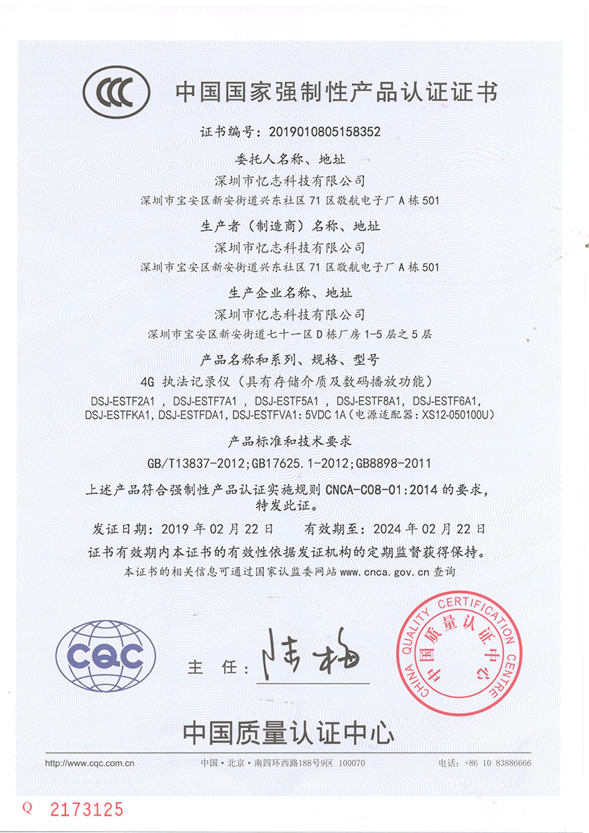 2月23日,忆志科技正式收到了由中国质量认证中心颁发的4G执法记录仪3C证书。